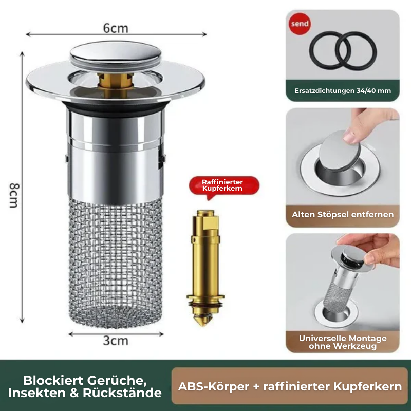 Undichte oder veraltete Abflussstopfen? Schlechter Geruch oder Wasser, das nicht richtig abläuft? Mit Drainix™, dem universellen Klick-Stopfen mit Kupferkern, machen Sie Schluss mit Lecks und unangenehmen Gerüchen – einfach, rostfrei und passend für nahezu jedes Waschbecken. Perfekt für Küche, Bad und Gäste-WC.